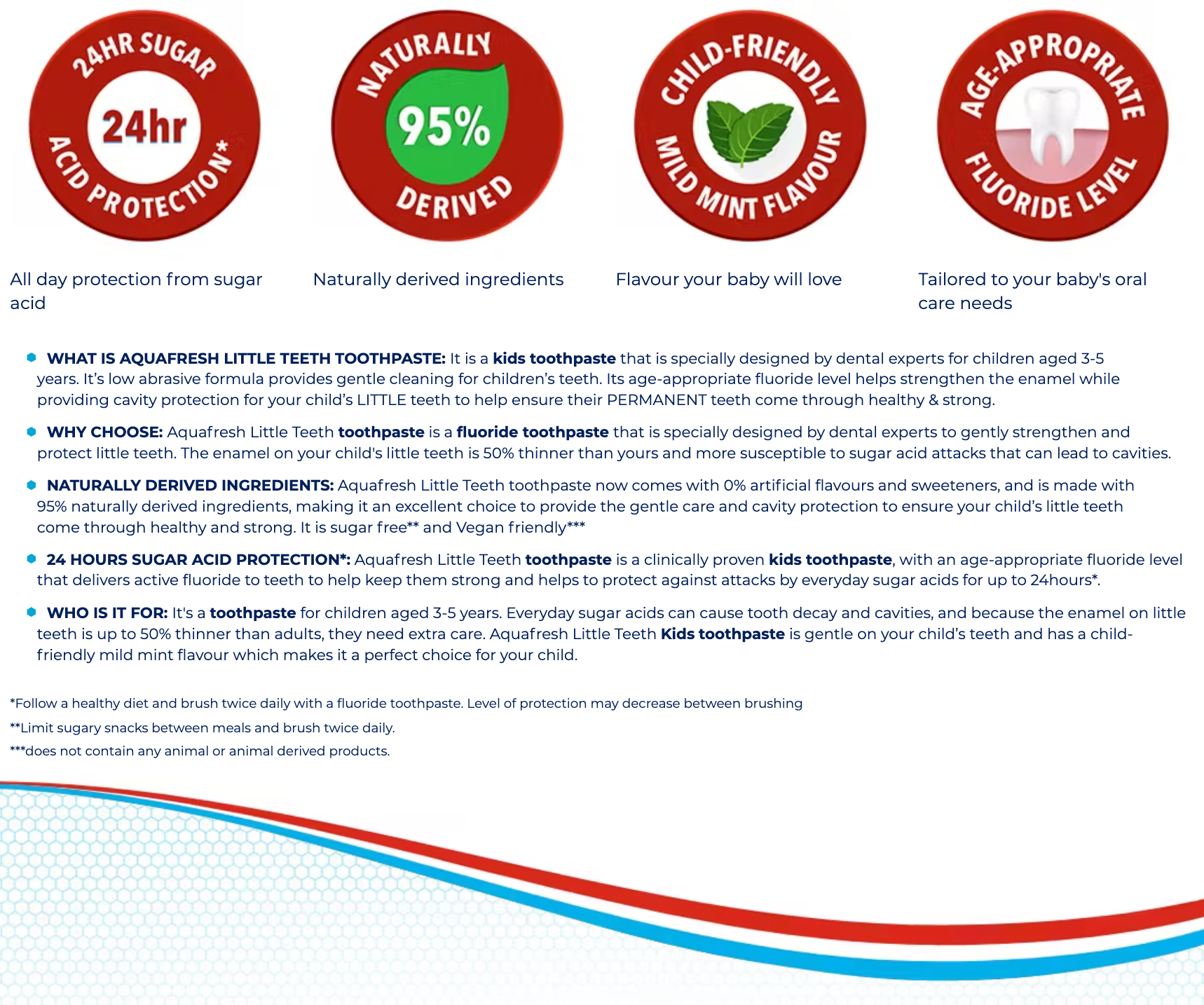 Aquafresh Baby Toothpaste is expertly formulated for children aged 3-5, featuring an age-appropriate fluoride level to gently protect little teeth while supporting the healthy development of permanent teeth. Its low abrasive formula ensures a gentle clean without irritation. Free from artificial flavors and sweeteners, this toothpaste offers 24-hour protection against sugar acids, helping to defend your child’s teeth from everyday sugar exposure and promoting long-term oral health.