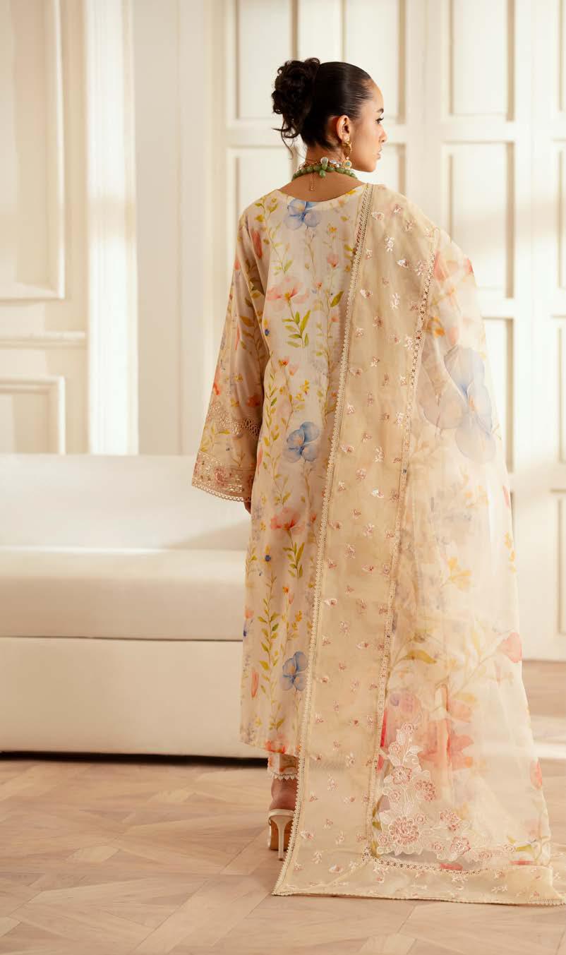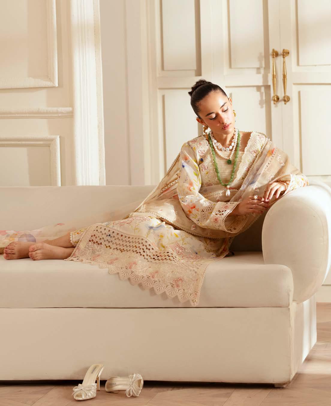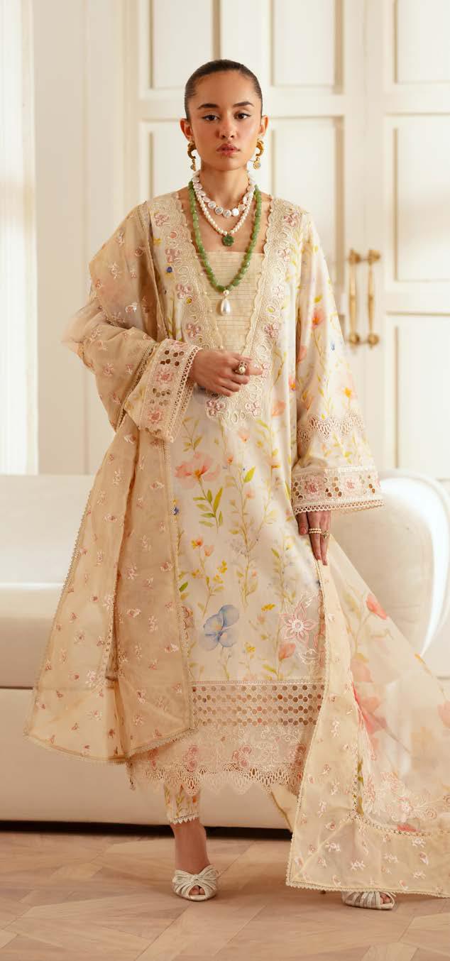 This unstitched elegant set includes an embroidered and printed lawn shirt paired with an embroidered and printed organza dupatta, complemented by printed cotton trousers for a comfortable and stylish finish.