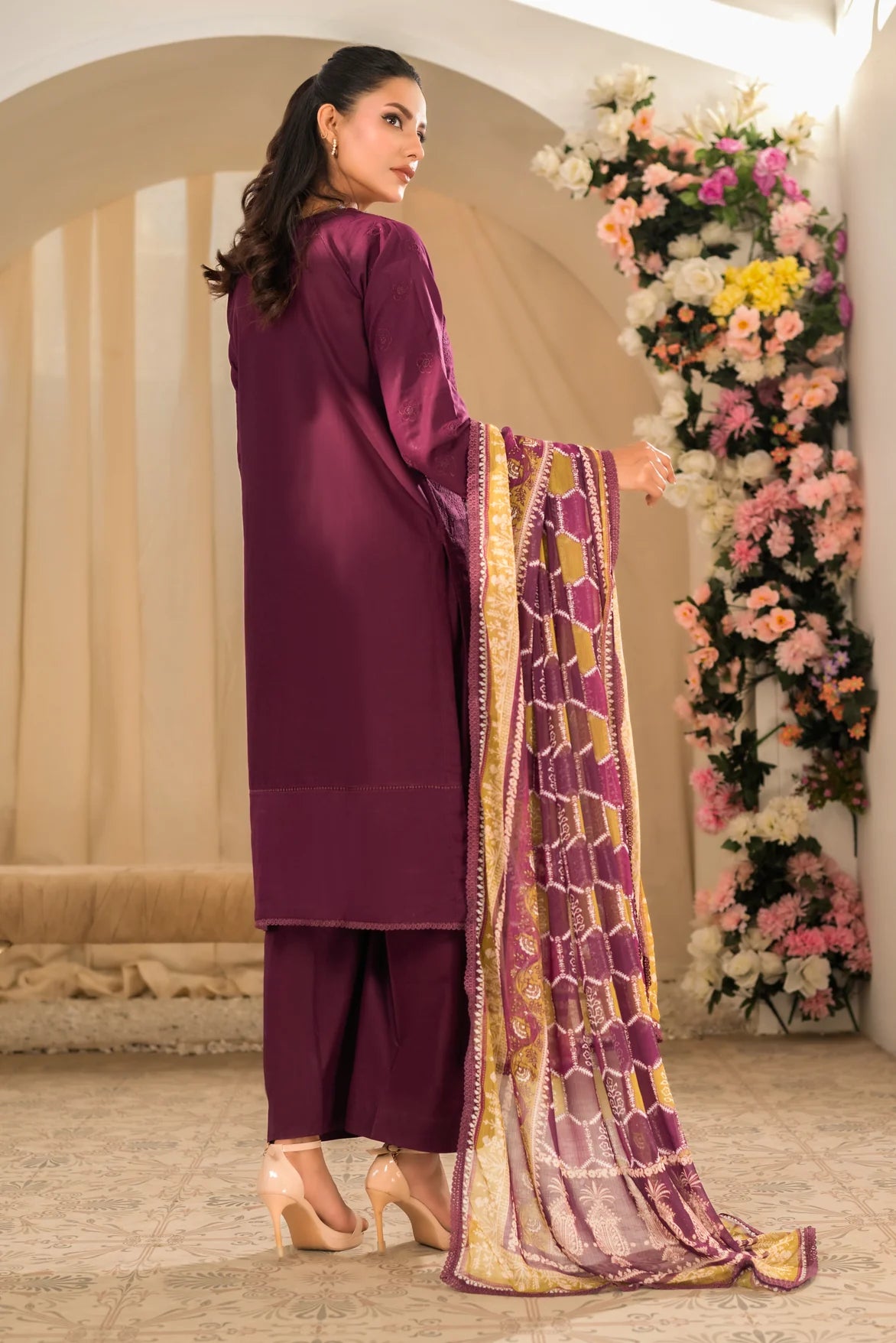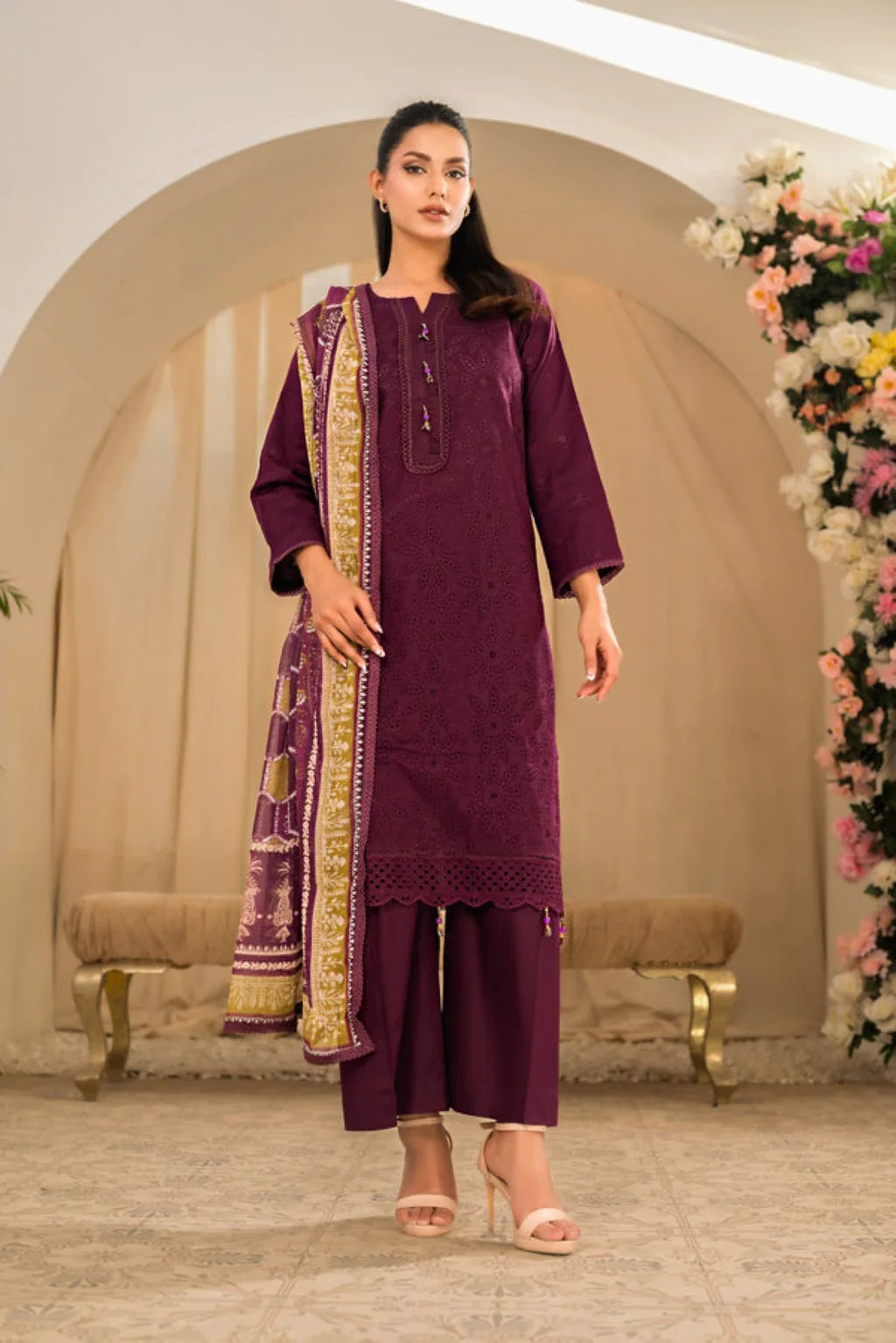 Experience the elegance of Tehzeeb by DOR, featuring finely dyed lawn fabric adorned with intricate chikankari embroidery on the front and sleeves. The embroidered sleeve borders add a refined touch, while the plain dyed lawn back ensures comfort and style. Complemented by a printed chiffon dupatta and dyed cotton trousers, this ensemble offers a sophisticated blend of traditional craftsmanship and contemporary design. Perfect for those who appreciate expert detailing and timeless grace.