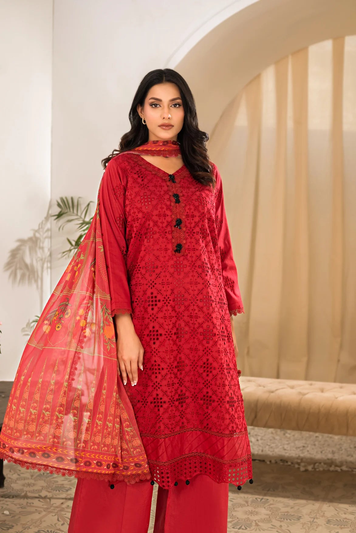 Experience the elegance of Tehzeeb by DOR, featuring finely dyed lawn fabric adorned with intricate chikankari embroidery on the front and sleeves. The embroidered sleeve borders add a refined touch, while the plain dyed lawn back ensures comfort and style. Complemented by a printed chiffon dupatta and dyed cotton trousers, this ensemble offers a sophisticated blend of traditional craftsmanship and contemporary design. Perfect for those who appreciate expert detailing and timeless grace.