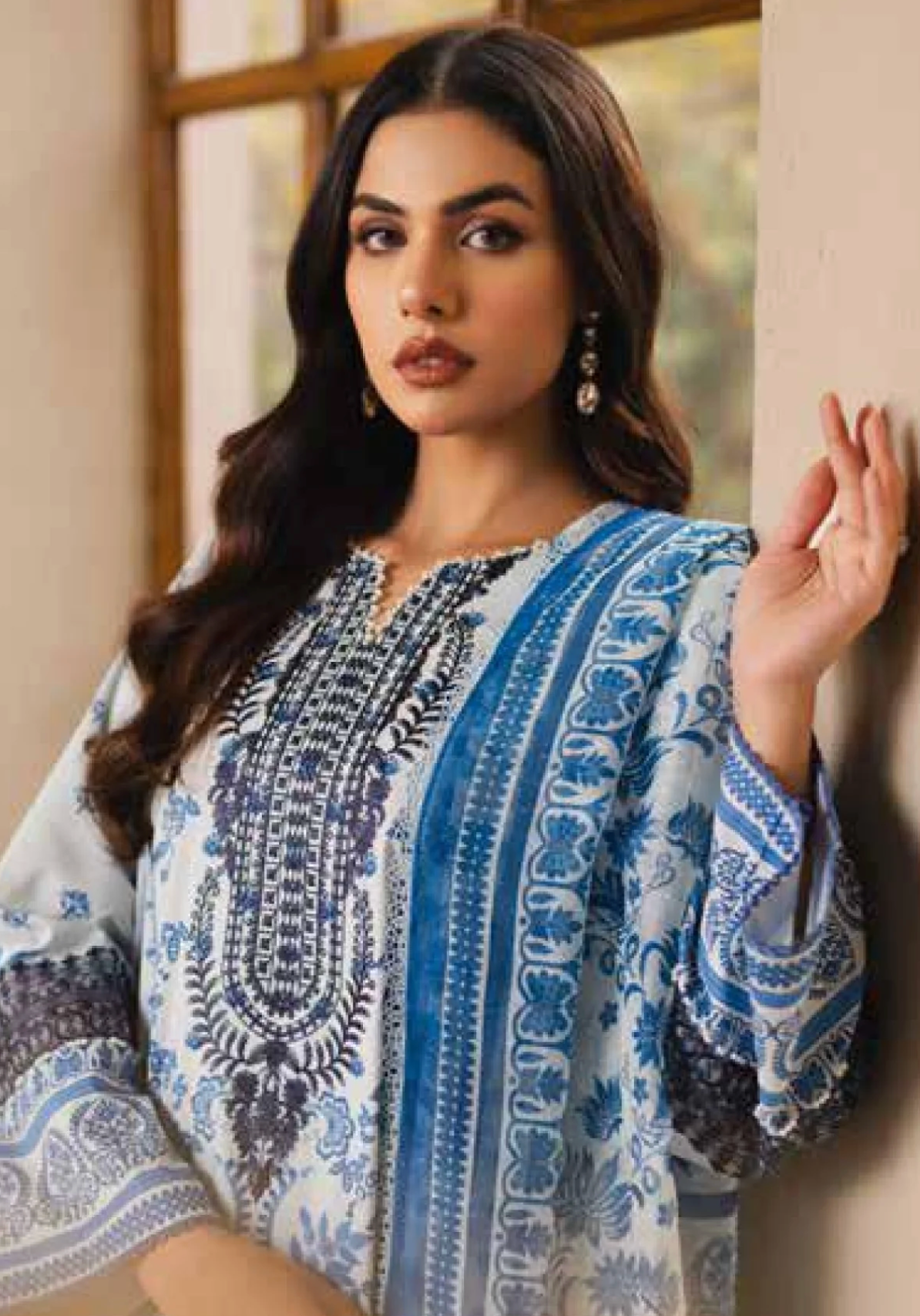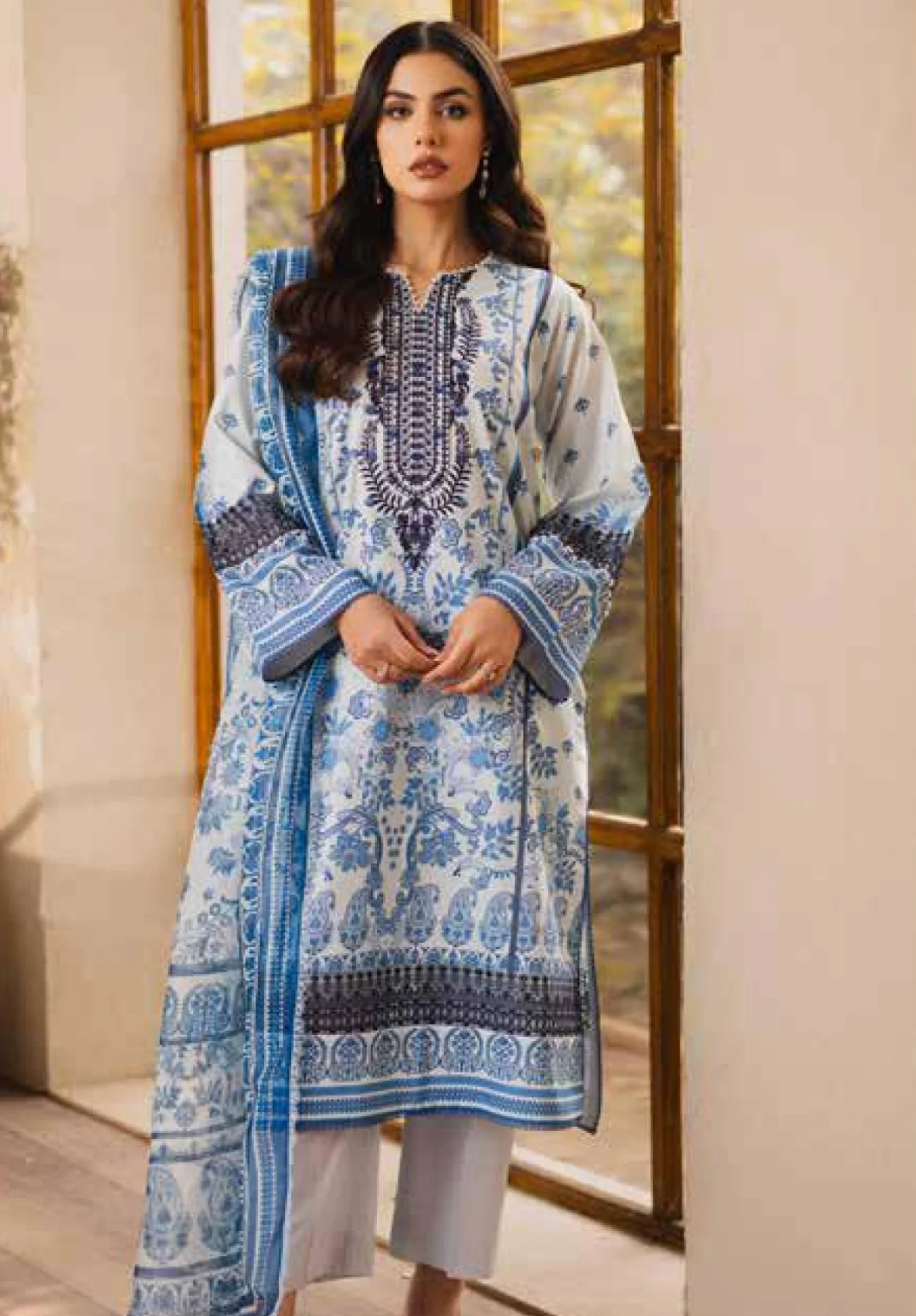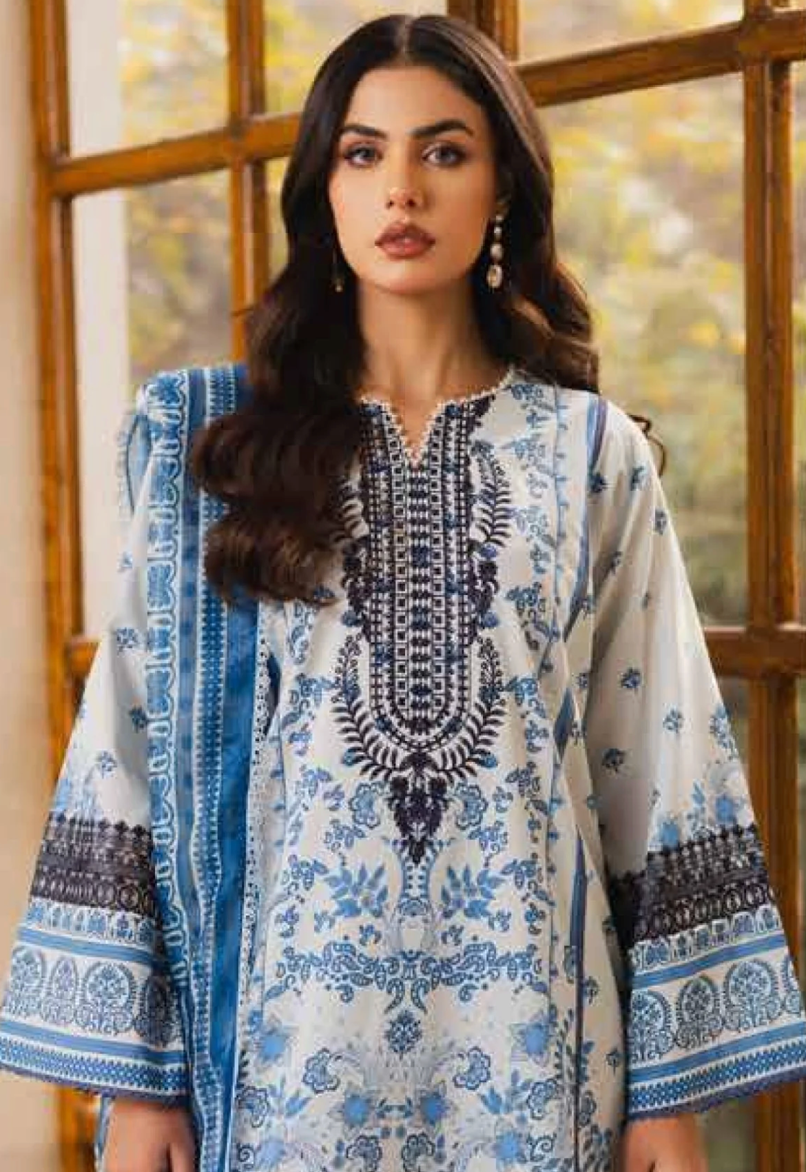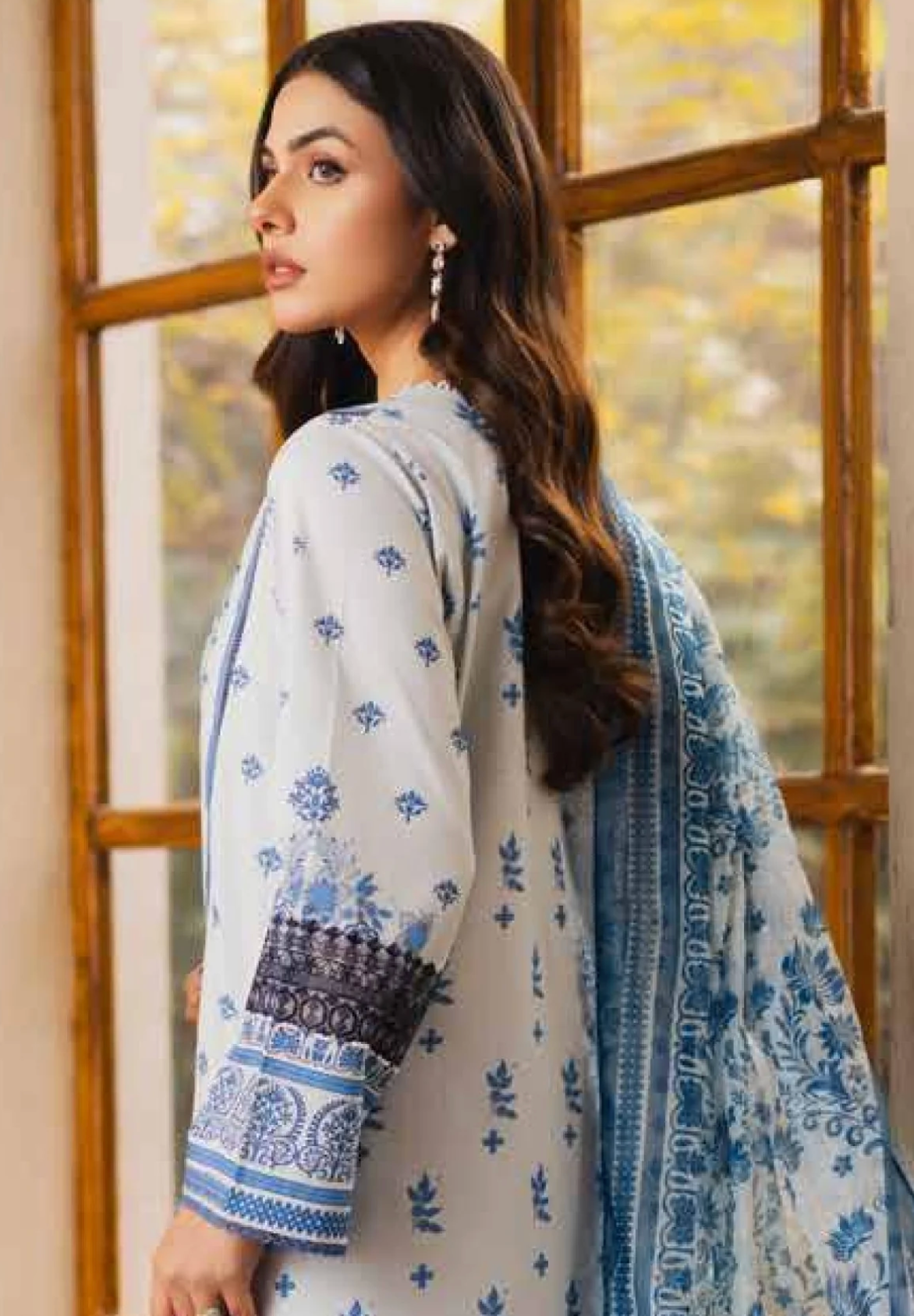 This elegant three-piece eastern ensemble features a printed lawn long shirt with exquisite organza embroidery on the front neck and sleeves. It is paired with a dyed cambric trouser and a printed jacquard dupatta, combining detailed craftsmanship with breathable fabrics. Perfectly suited for the lawn season, this set offers both comfort and sophistication. Please note, the color may vary slightly due to photography lighting effects.
