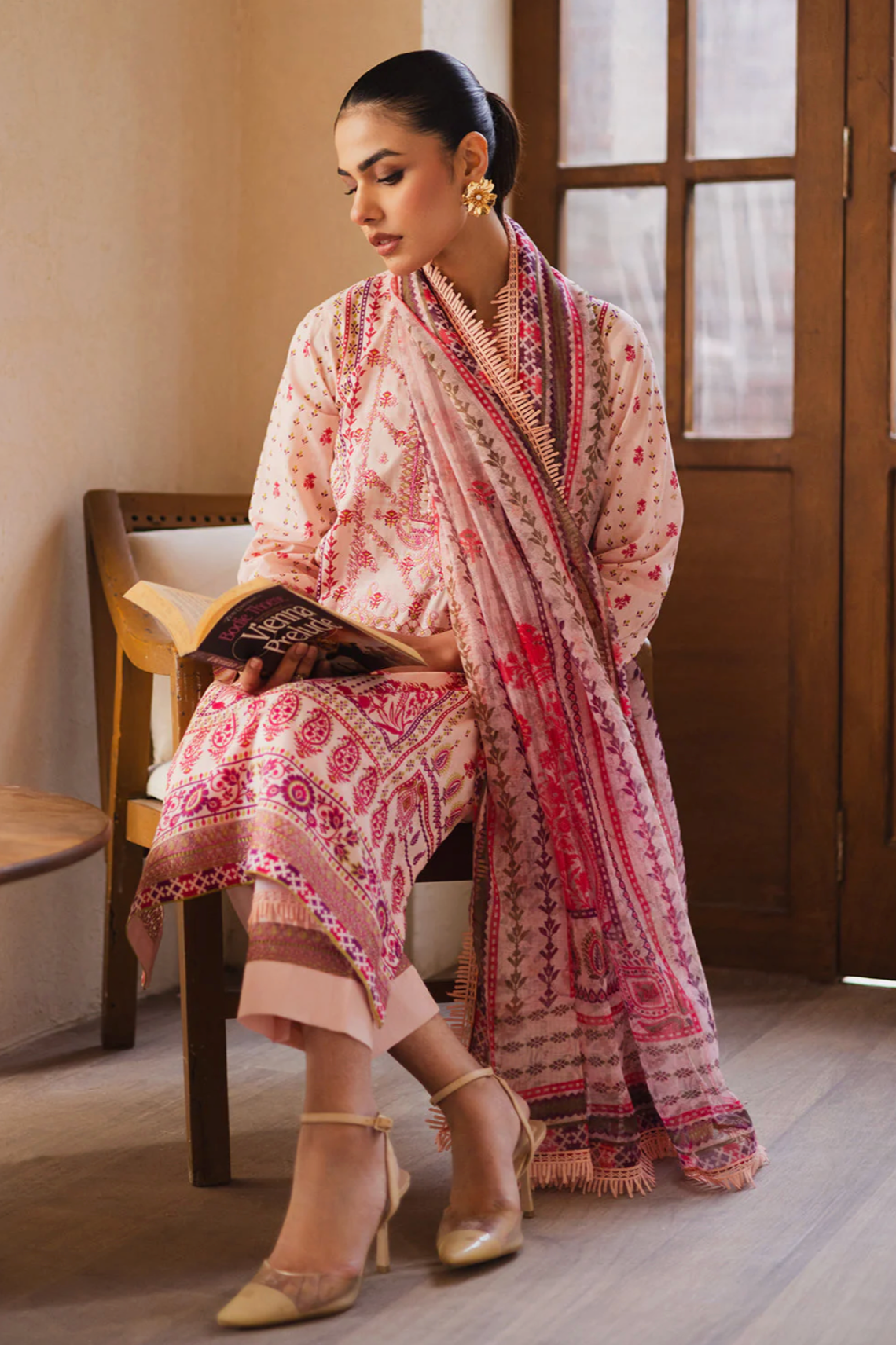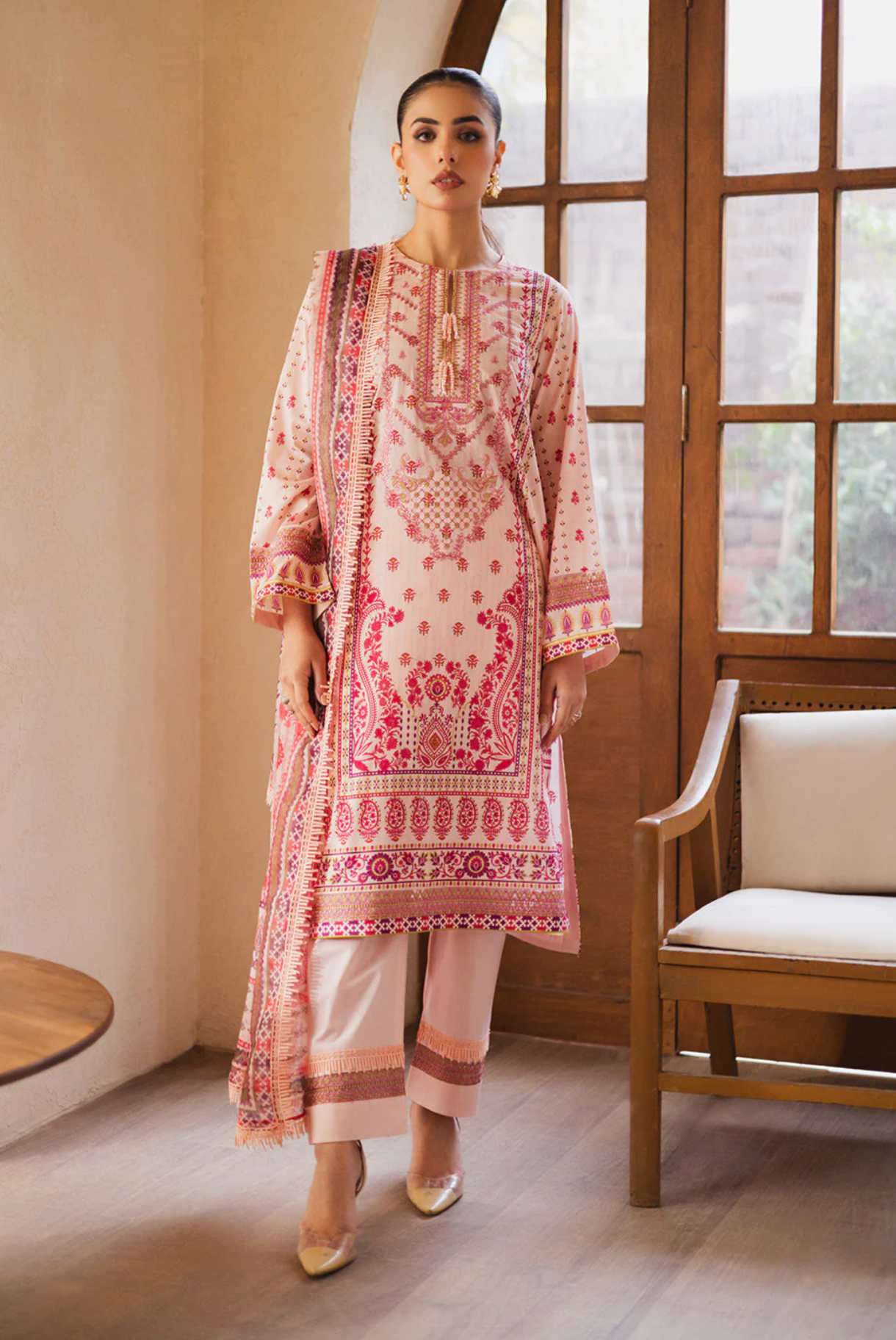 Experience elegance with the Zen by Freesia Premium - Valiqa Kurta Set, crafted for the lawn season. This three-piece ensemble features a breathable lawn shirt with intricate organza embroidery on the front neck and back sleeves, a printed monark dupatta, and a dyed cambric trouser. The blend of premium fabrics ensures comfort while the detailed embroidery adds a refined touch, making it ideal for sophisticated Eastern wear. Please note that colors may vary slightly due to photography lighting.